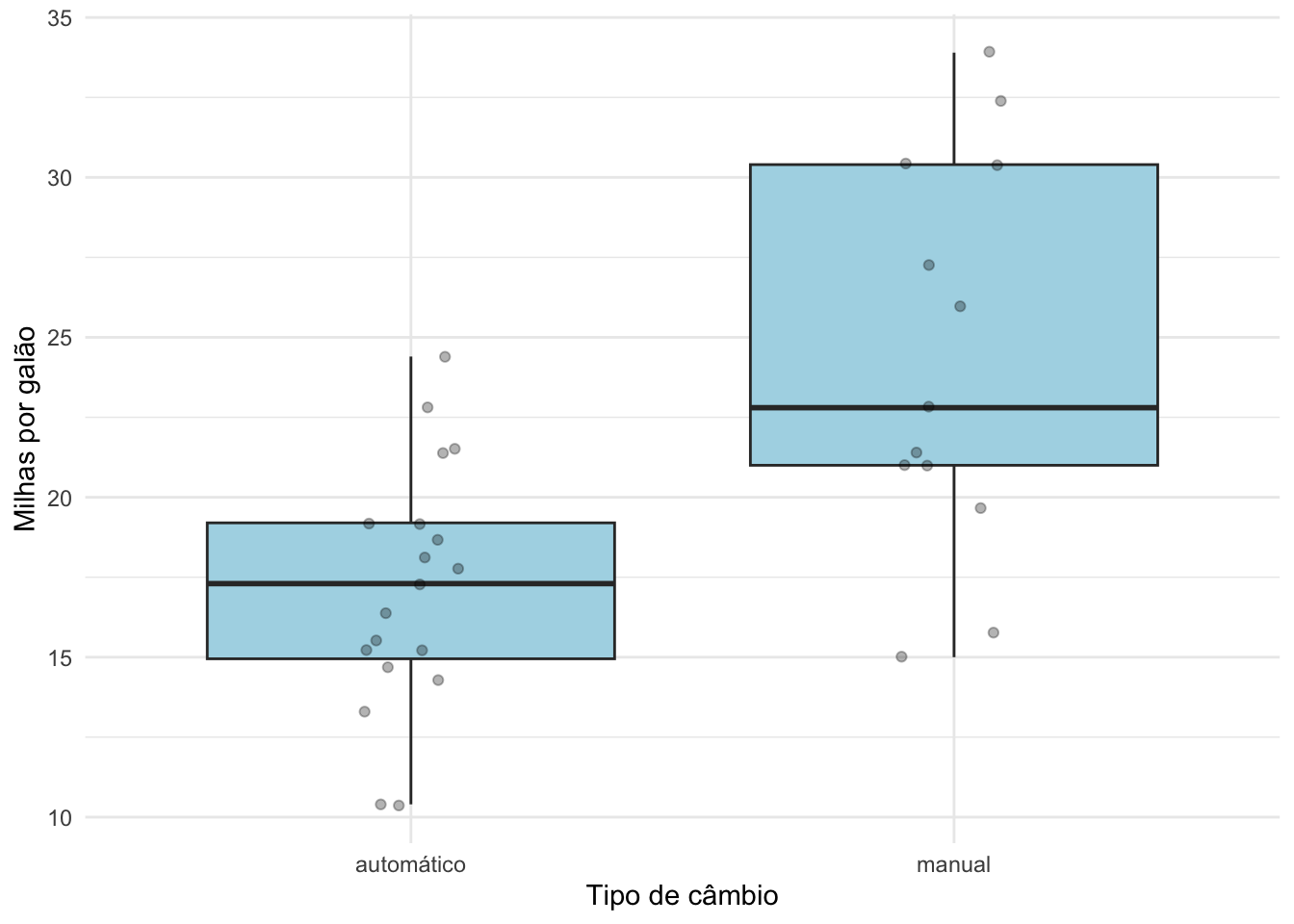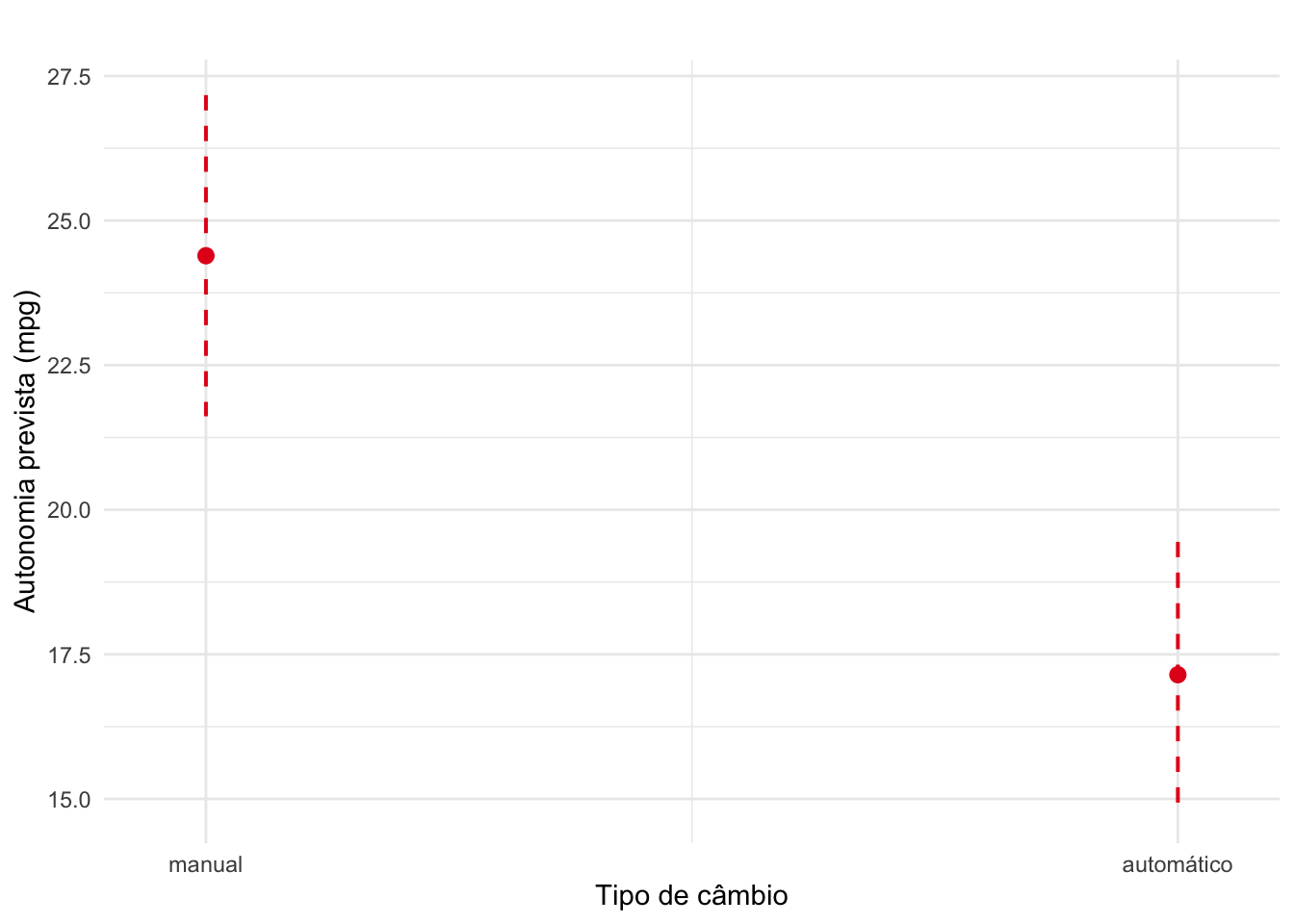 labs(title = "", y = "Autonomia prevista (mpg)", x = "Tipo de câmbio") +
